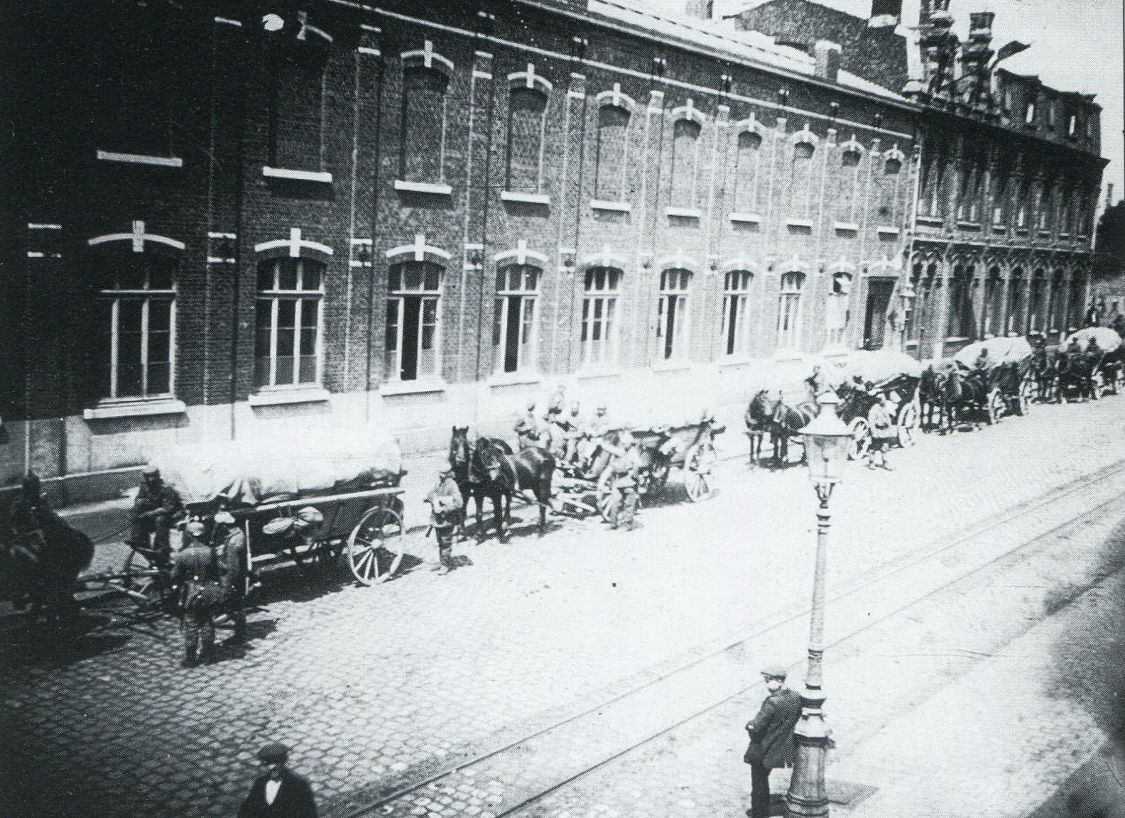 Un convoi de chariots allemands stationne devant l'Ecole du Sacré Coeur.
